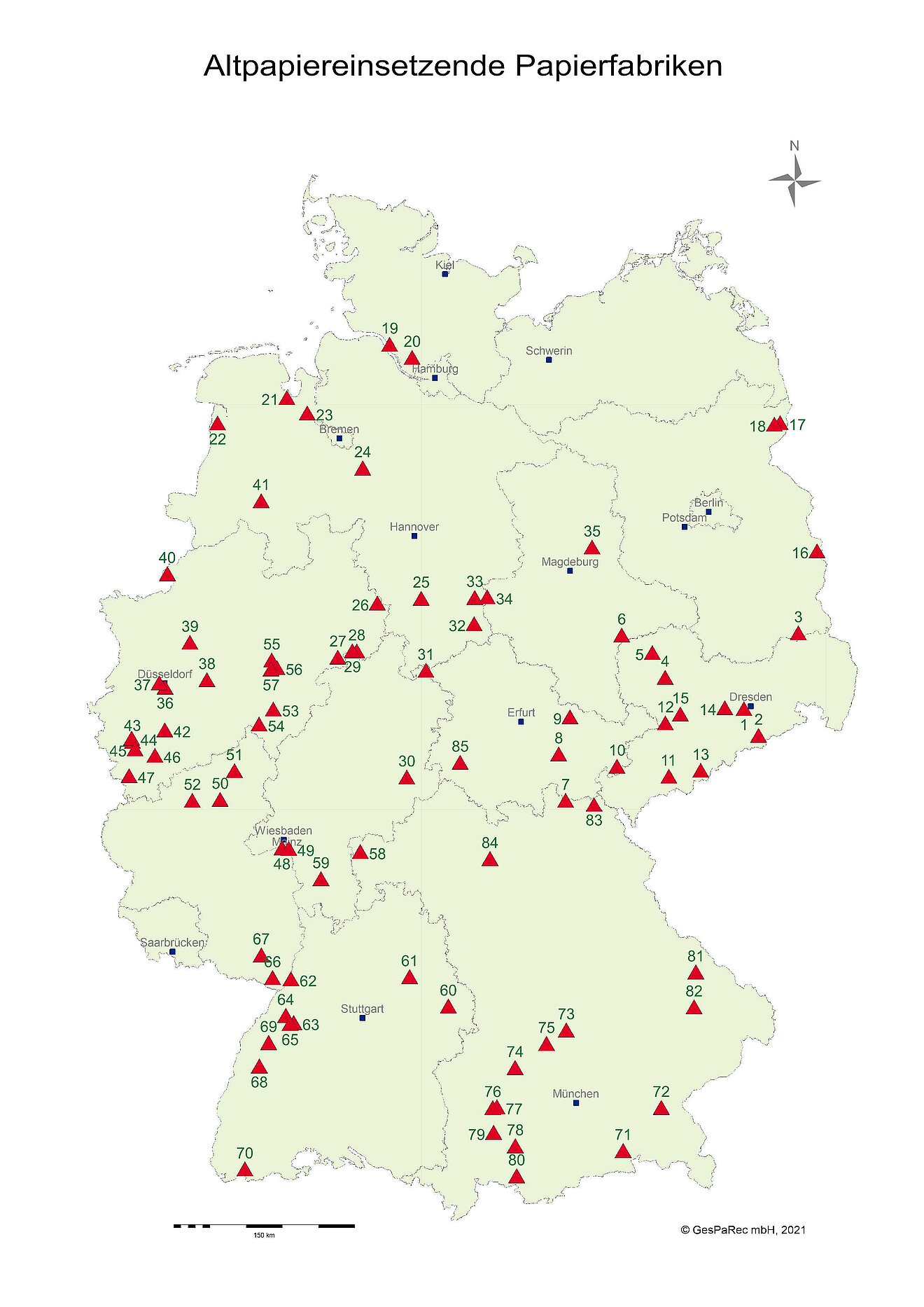 Die GesPaRec verfügt zur Zeit über eine Deutschlandkarte mit Adressenliste von 85 altpapiereinsetzenden Firmen.